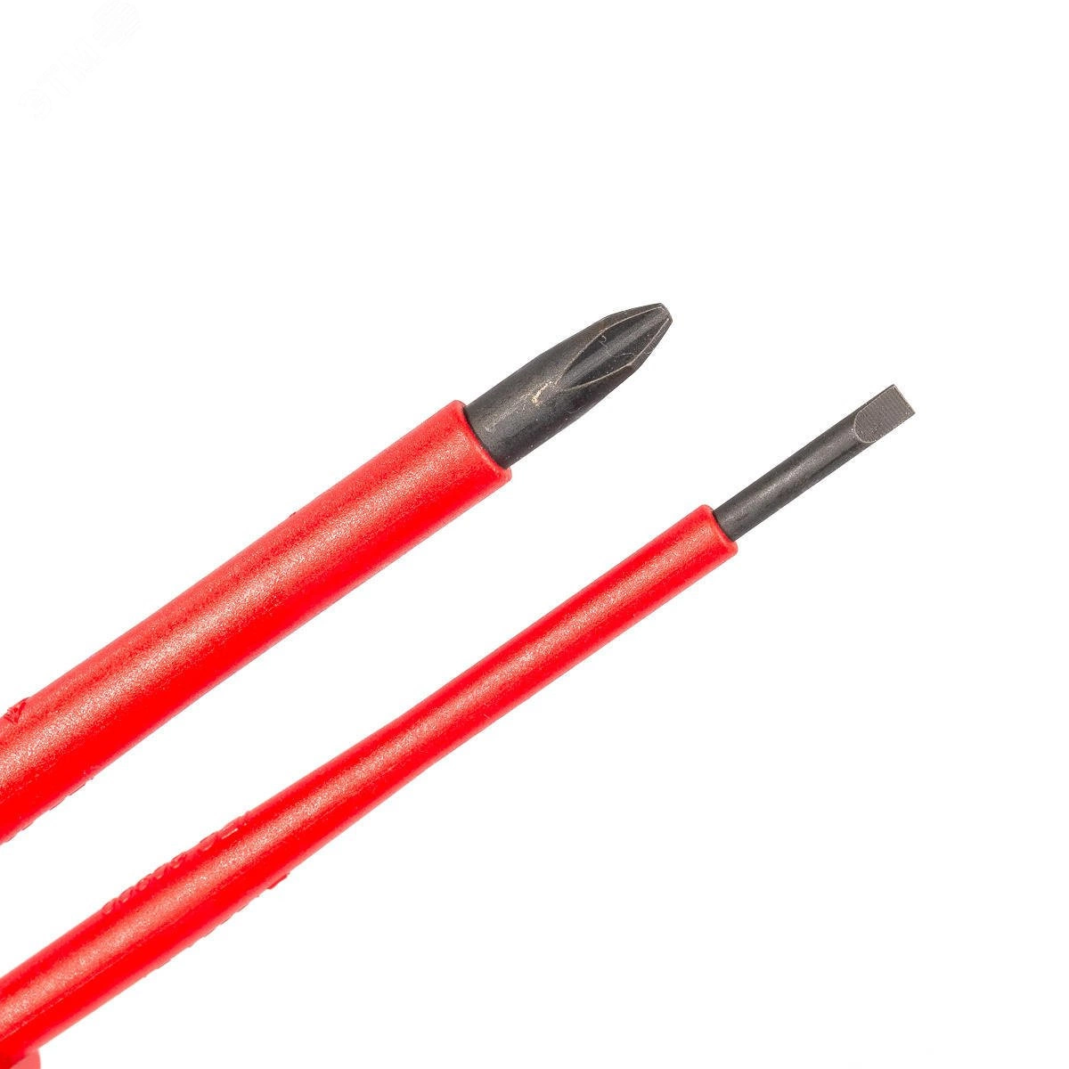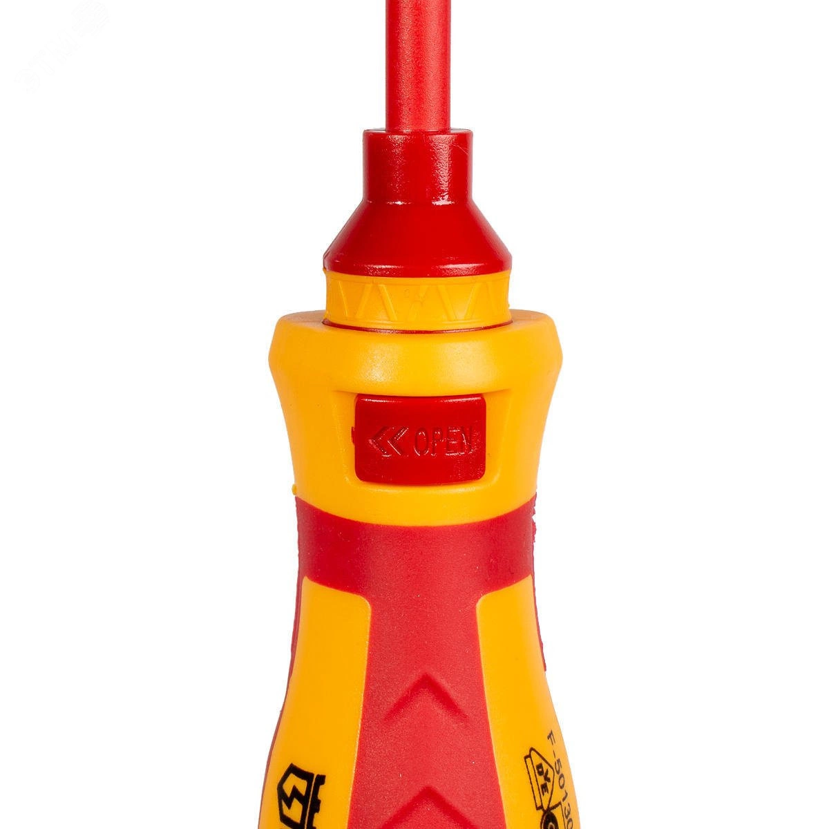 Для работы под напряжением до 1000 В. Материал стержня биты - хром-ванадиевая сталь. Вороненые намагниченные наконечники. Материал изоляции биты - полипропилен. На каждой бите — маркировка типоразмера. Двухкомпонентная рукоятка с мягкими вставками из термопластрезины. Патентованный пружинный механизм фиксации биты в рукоятке. Упаковка - прочная раскладывающаяся сумка с широкой застежкой-липучкой. Вес набора - 340 г.