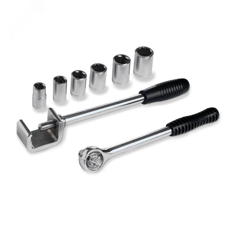 В комплекте - струбцина из хромированной стали для фиксации наконечников и соединителей реверсивный ключ-трещотка на 1/2' 6 сменных головок с внутренним шестигранником - 8, 10, 12, 14, 17, 19 ммтканевая сумка. струбцина из хромированной стали для фиксации наконечников и соединителей, Реверсивный ключ-трещотка на 1/2'. 6 сменных головок с внутренним шестигранником - 8, 10, 12, 14, 17, 19 мм тканевая сумка. Диапазон сечений монтируемых наконечников и соединителей - 10–400 мм. Возможно использование струбцины для разворота и ориентирования жил кабеля. Вес комплекта - 1.30 кг. Длина струбцины - 290 мм