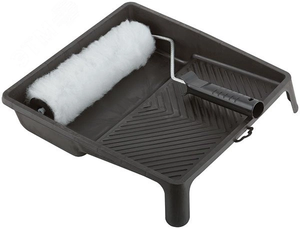 Ванночка пластиковая 350х330 мм. Валик 250 мм, искусственный мех. Ворс 10 мм. O 42/49 мм. Бюгель 5 мм. Система с гайкой. Используется с вододисперсионными красками. Упаковка - п/э пакет с подвесом.