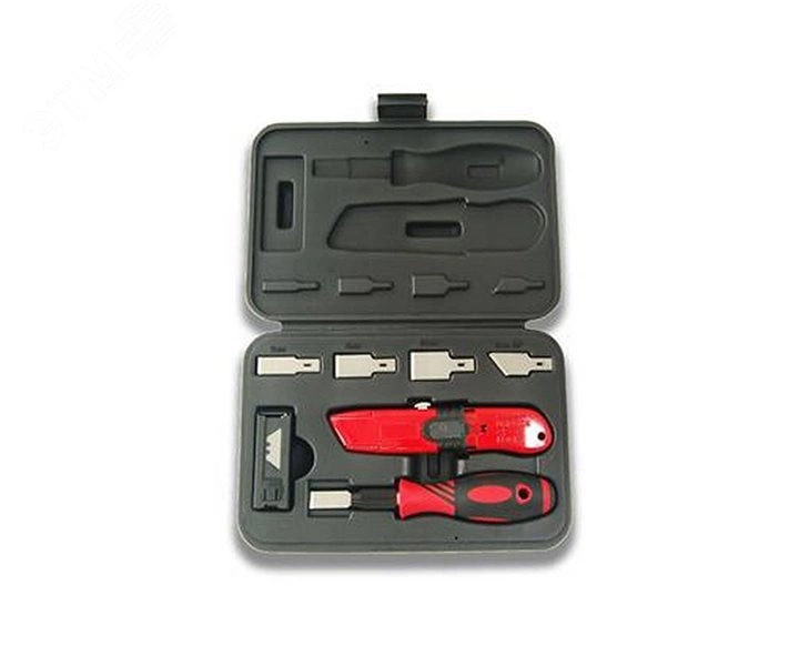 Разработан для аккуратного и чистого среза полиуретана. Комплект поставляется в пластиковом кейсе, который значительно упрощает транспортировку. Простоту работы обеспечивает комплект лезвий с различным углом наклона режущей кромки. Рукоятки выполнены из алюминия, покрыты полипропиленом и резиной. Лезвия обладают твердостью 60-64 HRC.