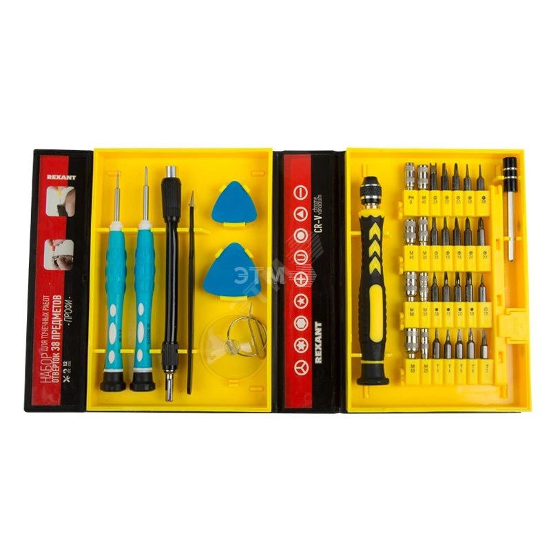 Набор для точных работ REXANT 'Профи' 38 в 1 оптимально подходит для выполнения прецизионных работ в электронике и электромеханике, ремонта телефонов, планшетов, ноутбуков, электронных книг, часов, в т. ч. MacBook и iPhone. Биты выполнены из качественной хромованадиевой стали, обладающей высокой прочностью к механическим повреждениям и образованию ржавчины. Прорезиненные пластиковые рукоятки эргономичной формы с вращающимися шляпками не скользят в ладони, что обеспечивает дополнительный комфорт при работе. Цанговый зажим отвертки обеспечивает быструю замену и надежную фиксацию насадок. Пинцет с изогнутыми острыми губками помогает работать с мелкими деталями. Набор инструментов и бит поставляется в пластиковом прорезиненном футляре для удобного хранения и транспортировки.