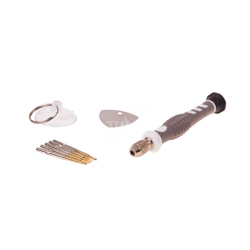 Набор отверток REXANT 8 в 1 оптимален для выполнения прецизионных работ в электронике и электромеханике, ремонта большинства видов и моделей популярной портативной техники (смартфонов, часов, планшетных ПК, игровых приставок, фотокамер, электронных сигарет). Комплект пригодится для ремонта техники Apple. Инструменты выполнены из качественной стали, обладающей высокой прочностью к механическим повреждениям и образованию ржавчины. Отвертка эргономичной формы обладает вращающейся шляпкой и противоскользящей рукояткой. В наборе предусмотрены медиатор для снятия корпуса, извлечения деталей, схем и присоска для удаления экрана. Цанговый зажим обеспечивает быструю замену и надежную фиксацию насадок.