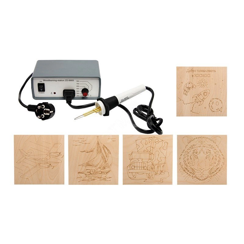 Выжигание по дереву — прекрасное хобби как для ребенка, так и для взрослого. В набор для выжигания REXANT входит универсальный выжигательный прибор с функцией термоконтроля и комплект досок для выжигания с нанесенными силуэтами рисунков в количестве 5 штук. Прибор для выжигания по дереву предназначен для выжигания рисунков или орнамента на дреевянных поверхностях или коже. Удобная эргономичная рукоятка выполнена из термостойкого пластика и имеет кольцо, которое убережет паяльное жало от соприкосновения с другими предметами, в том числе исключая случайные ожоги. В комплекте к прибору поставляются доски для выжигания изготовленные из качественной шлифованной фанеры.
