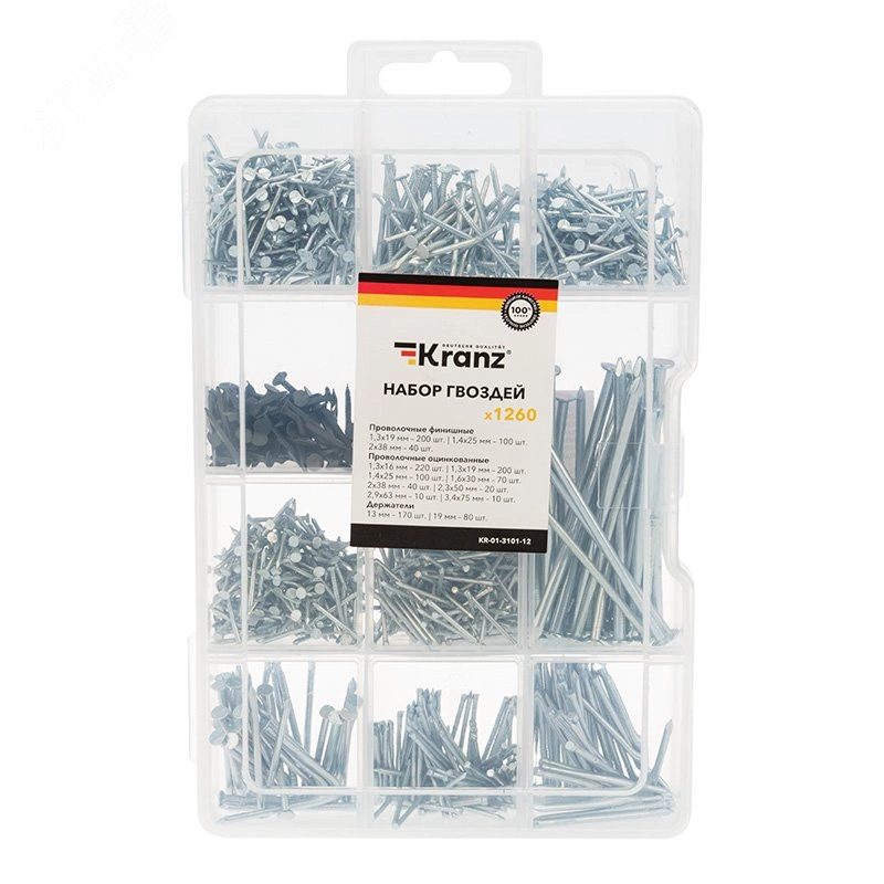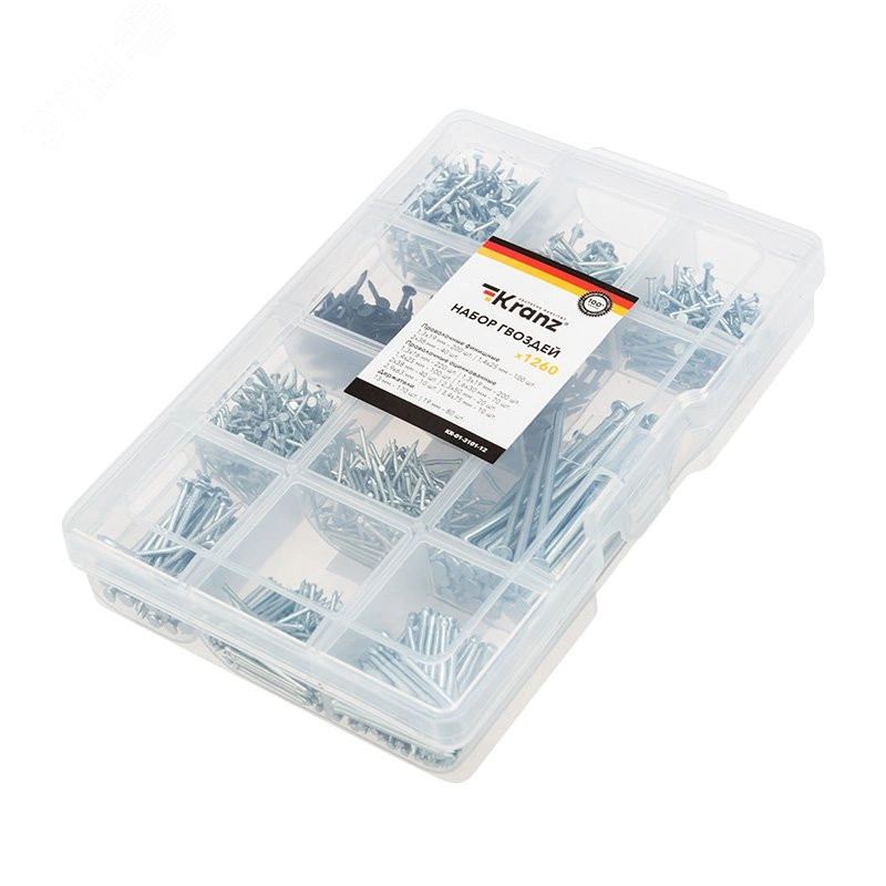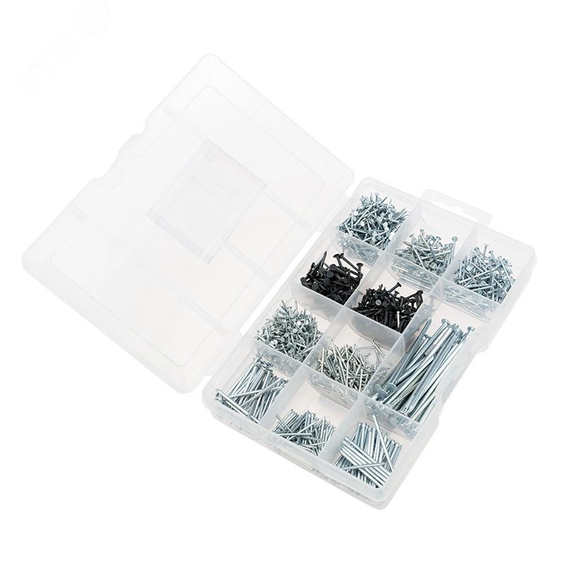 Набор гвоздей в ассортименте. Набор состоит из 1.Проволочные финишные гвозди 1,3x19 мм - 200 шт, 1,4x25 мм - 100 шт, 2,0x38 мм - 40 шт. 2. Гвозди проволочные, оцинкованные 1,3x16 мм - 220 шт, 1,3x19 мм - 200 шт, 1,4x25 мм - 100 шт, 1,6x30 мм - 70 шт, 2,0x38 мм - 40 шт, 2,3x50 мм - 20 шт, 2,9x63 мм - 10 шт, 3,4x75 мм - 10 шт. 3. Держатель 13 мм - 170 шт, 19 мм - 80 шт. 4. Пластиковый органайзер.