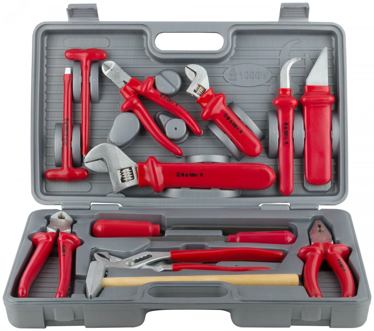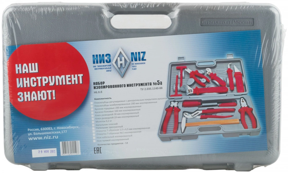Универсальный набор слесарного изолированного инструмента ''НИЗ'' включает в себя все самые необходимые комплектующие для проведения ремонтных работ в действующих электроустановках напряжением до 1000В переменного и 1500В постоянного тока. Инструменты пригодны для эксплуатации при температуре воздуха от –20 до +70 градусов. В наборе 13 предметов. Инструменты изготовлены из токоведущих сталей и покрыты электроизоляционным материалом. Термообработка токоведущих частей, изготовленных из углеродистых и легированных сталей, обеспечивает высокую прочность, надежность и долговечность инструментов. Материал изолирующего покрытия отверток — однослойный полистирол красного цвета, остальных инструментов — грунтовка и двухслойный пластизоль контрастных цветов - белого и красного (толщина каждого слоя около 2 мм). Инструменты оснащены защитными упорами, предотвращающими соскальзывание руки в рабочую зону. Набор поставляется в пластиковом кейсе с удобной ручкой.