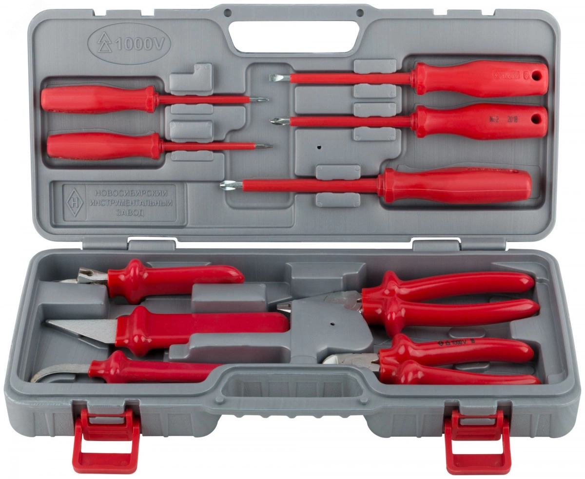 Изолированный. 1000В. Комплектация - пассатижи200 мм, кусачки боковые 160 мм, ключ разводной19 мм, нож для снятия изоляции кабельный, нож для снятия изоляции прямой, отвертка плоская0,6 х 4, отвертка плоская 1,0 х 6,5, отвертки крестовые - PH1, PH2, PH3. Упаковка - пластиковый чемодан.