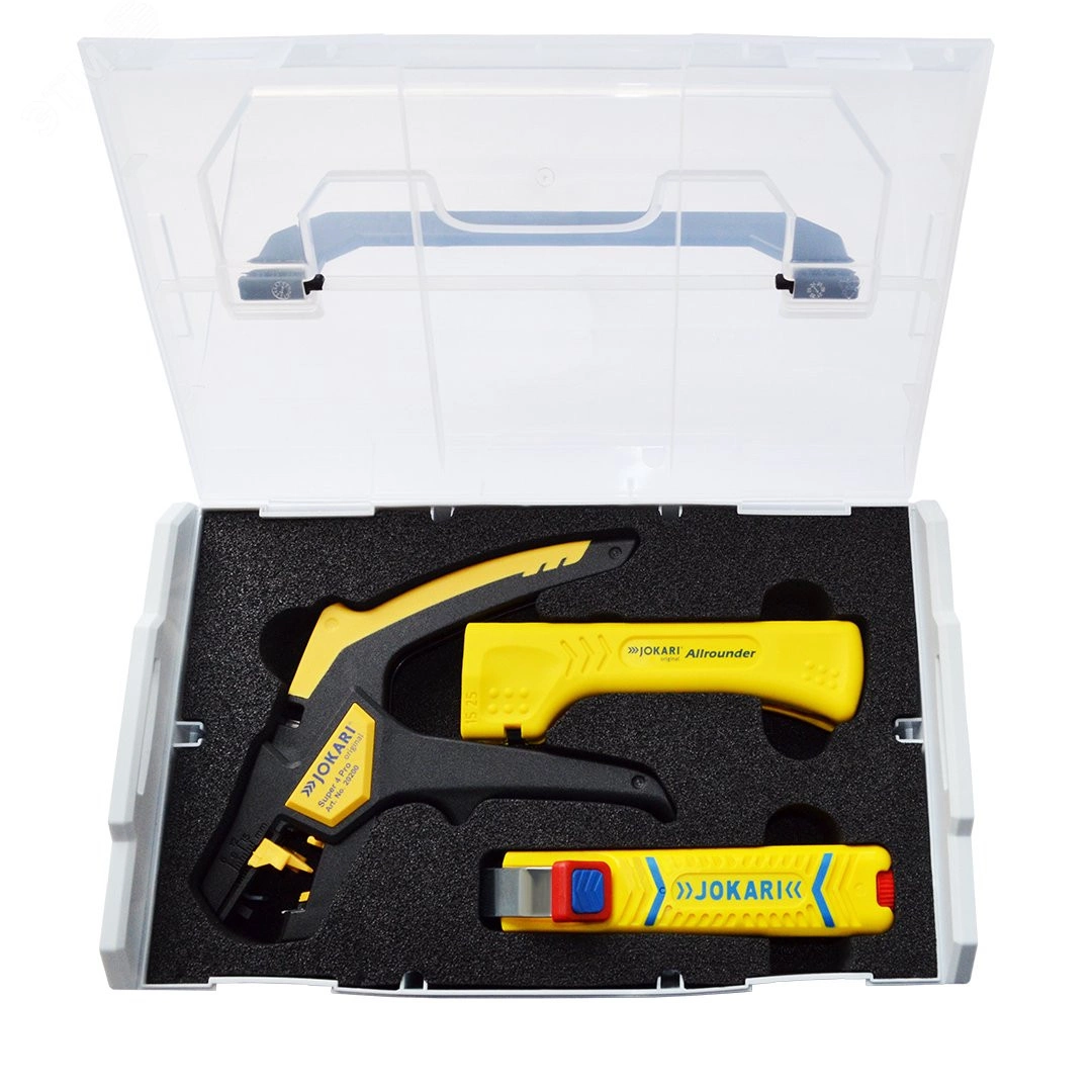 JOKARI SET – набор профессионального инструмента для снятия изоляции и кабельной оболочки в кейсе. Набор включает в себя все необходимые инструменты для работы с кабелем при проведении электромонтажных работ и позволит Вам - - снимать оболочку с круглого кабеля диаметром от 4 до 28 мм, - снимать оболочку с плоского кабеля шириной до 15 мм, - снимать изоляцию с проводов сечением от 0,2 до 50 мм2, Поставляется в эргономичном кейсе L-BOXX mini.