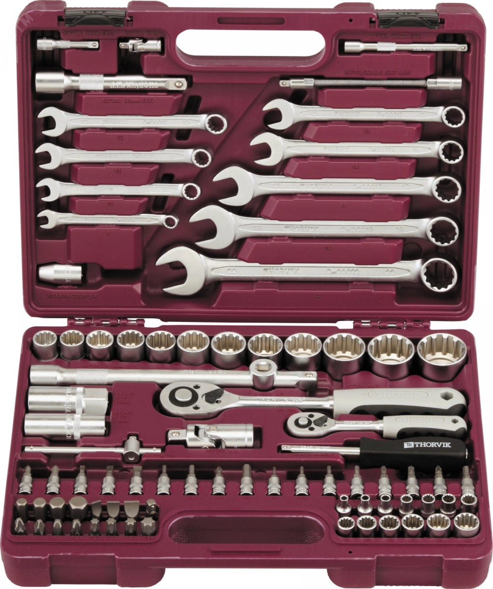 Универсальный набор инструмента 1/4`,1/2`DR THORVIK UTS0082MP включает в себя большое количество инструмента для работы с разнообразными типоразмерами крепежа. Комплект поставляется в прочном пластиковом кейсе. Удобное расположение элементов набора обеспечивает быстрый подбор нужного снаряжения. В качестве петли, соединяющей две части кейса, выступает прочный металлический стержень. Он обеспечивает стабильное многократное открывание/закрывание кейса.