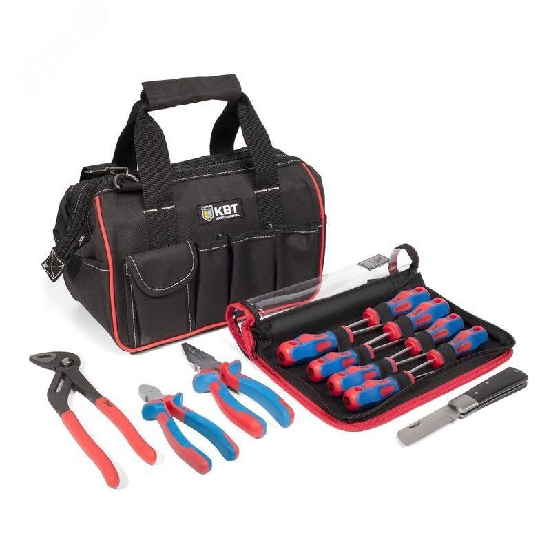 Состав набора - Пассатижи 180 мм серия 'МАСТЕР'. Бокорезы 160 мм серия 'МАСТЕР', набор слесарных отверток НО-08, нож монтерский НМ-01, клещи с кнопочной фиксацией 250 мм, сумка электромонтажника С-03. Универсальный набор для электромонтажа. Прочная сумка с большим количеством отделений и наплечным ремнем. Вес набора с сумкой -2.55 кг