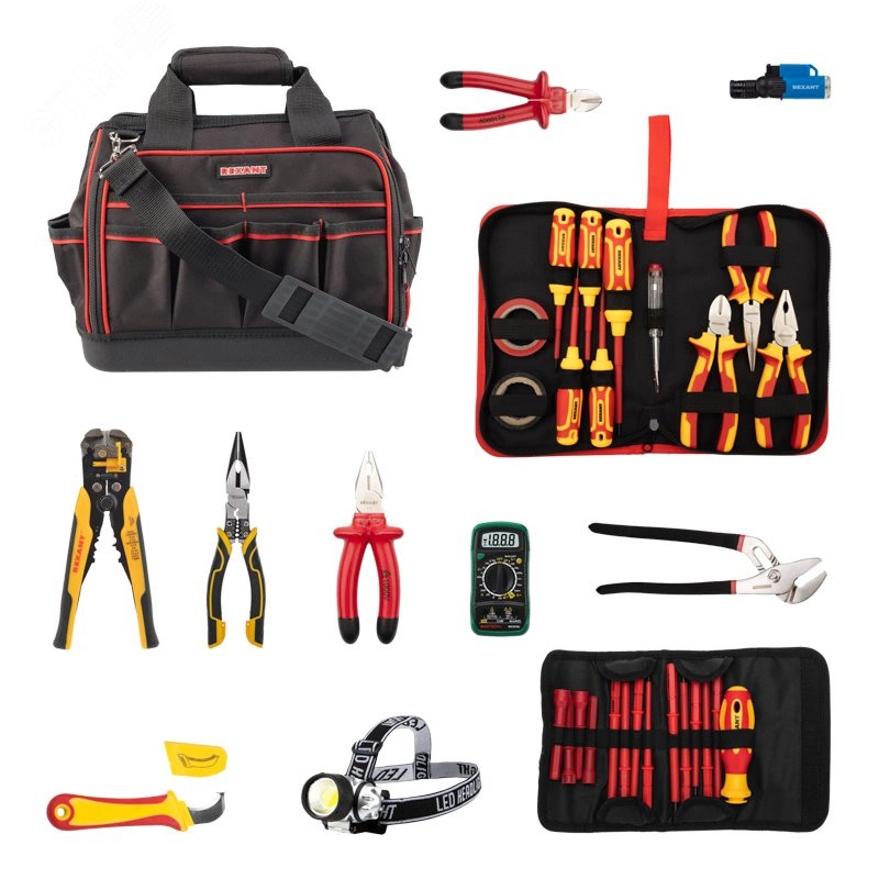 Набор инструментов электрика REXANT состоит из 29 предметов и позволяет провести весь цикл электромонтажа до 1000В. Диэлектрический набор имеет все необходимые инструменты для работы с напряжением до 1000В. В наборе собраны инструменты для зачистки кабеля, обжима клемм и безопасного подключения к щиту, а также диэлектрические отвертки с 14 шлицами, которые подойдут к любому оборудованию. Мультиметр обладает широким функционалом с функцией DATA HOLD и имеет подсветку. Налобный фонарь позволяет комфортно работать в слабоосвещённых местах. Тестер пробник со сменным наконечником удобен и прост в использовании. Сумка изготовлена из водонепроницаемого материала, что обеспечивает надежную защиту инструментов от воздействия влаги и повышает их долговечность. Набор подходит для профессионального использования.