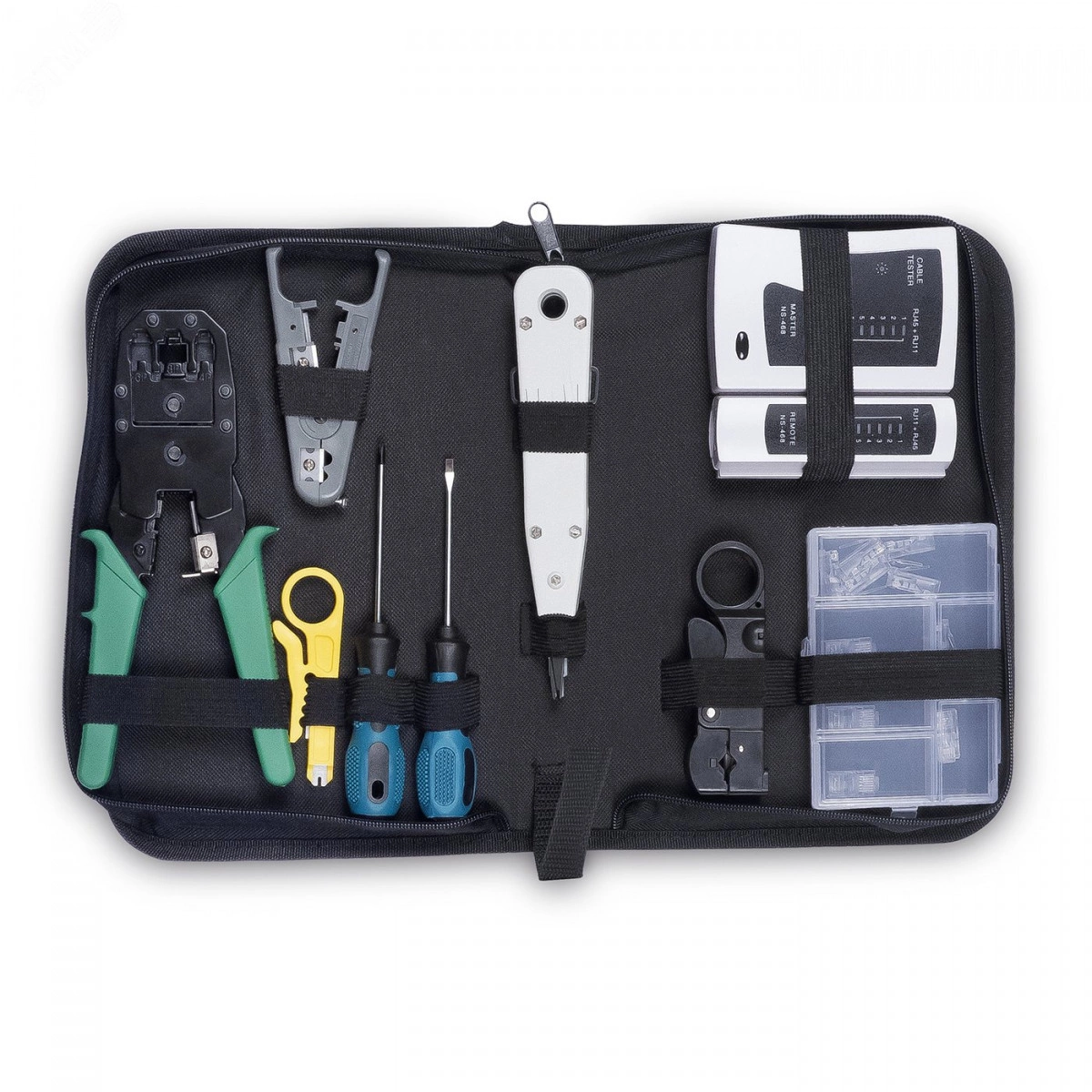 Универсальный набор инструмента предназначен для работы с кабелем витой пары и коаксиальных кабелей. Инструменты, входящие в набор, позволяют производить операции по обрезке и зачистке кабелей витой пары, разделке их на IDC-контактах патч-панелей и кейстоунов, заделке проводников на телефонных плинтах Krone, а также обжим коннекторов RJ-11/12 и RJ-45. Для удобства хранения и транспортировки инструменты поставляются вместе с сумкой-чехлом.