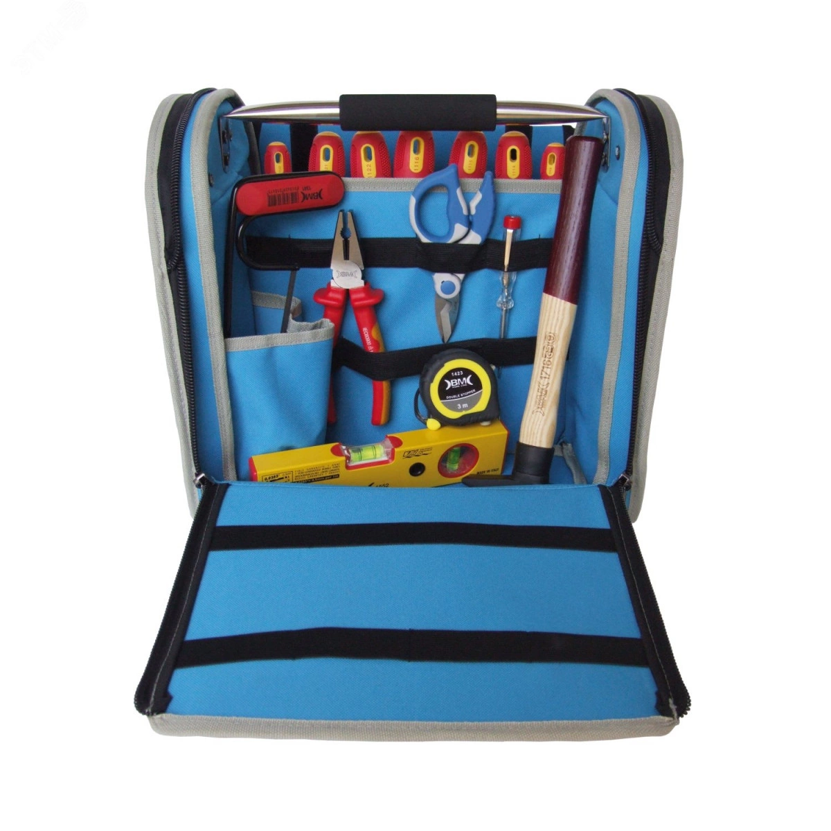 Набор инструментов электрика в сумке из прочного нейлона, со съёмным плечевым ремнём и алюминиевой ручкой для переноски. Комплектация: отвертки диэлектрическая шлицевые 3x100, 4x100, 5,5x125, 6,5x150, отвертки диэлектрические PH 0, PH 1, PH 2, индикаторная отвёртка 3x60 250 В, пассатижи диэлектрические 180 мм, ножницы электрика, компактная ножовка, рулетка 3 м, уровень 220 мм, молоток 300 гр.