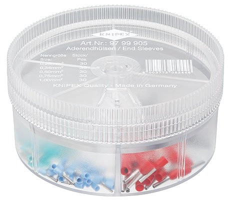 97 99 905 Наборы Практичная коробка для наборов, которую можно ставить одну на другую. удобная прозрачная коробка. поворотная крышка с отверстием для извлечения контактных гильз. с изолированными контактными гильзами, стандартная цветовая кодировка. Формат - диаметр 90 мм, высота 44 мм. Комплект поставки - 30 x KNIPEX гильзы контактные Синий 10 мм (30 x 0,25 mm?/ AWG 24), 30 x KNIPEX гильзы контактные бирюзовый 10 мм (30 x 0,34 mm?/ AWG 22), 30 x KNIPEX гильзы контактные белый 14 mm (30 x 0,5 mm?/ AWG 20), 30 x KNIPEX гильзы контактные серый 14 mm (30 x 0,75 mm?/ AWG 18), 30 x KNIPEX гильзы контактные Красный 14 mm (30 x 1 mm?/ AWG 17),