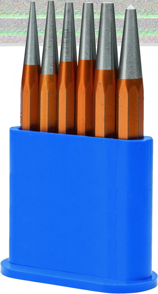 Профессиональный набор из 5 пробойников и керна. Изготовлены из закаленной на воздухе хромванадиевой стали. Ударные концы отшлифованы и покрыты прозрачным лаком. Улучшенный боек. Поставляется в ударопрочном компактном пластиковом держателе размером 125х75х40 мм.
