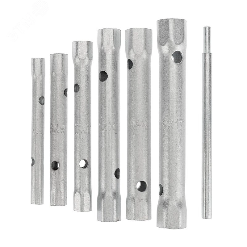 Набор ключей-трубок торцевых предназначен для монтажа и демонтажа болтовых соединений в труднодоступных местах. С обеих сторон расположен захват разных размеров. Кольцевой захват имеет 6 граней, благодаря чему улучшается сцепление с крепежом и уменьшается риск повреждения граней крепежа. Для удобства использования поставляются с воротком. Инструмент изготовлен из углеродистой стали 45. Твердость материала рабочей части ключа 41 HRC.