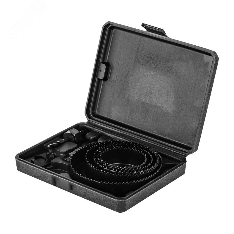 Набор кольцевых пил предназначен для сверления древесины, ДСП, ДВП и пластика. Пилы применяются совместно с дрелью, станком или шуруповертом. Изготовлены из углеродистой стали, устойчивой к повреждениям. Зубья пил разведены, что облегчает удаление стружки и увеличивает скорость сверления. Сверление необходимо осуществлять в безударном режиме с применением СОЖ. В комплект входит центрирующее сверло, упрощающее центровку пилы, что позволяет получать отверстия правильной формы. Также в наборе предусмотрен шестигранный ключ 2,5 мм, позволяющий надежно зафиксировать сверло в державке. Набор поставляется в удобном пластиковом кейсе с ложементами, что облегчает его хранение и транспортировку. В комплектацию входят пилы размером 64, 76, 89, 102, 127 мм - 5 шт, хвостовики шестигранные 9,5 мм и 11 мм – 2 шт, шестигранный ключ 2,5 мм, центрирующее сверло.