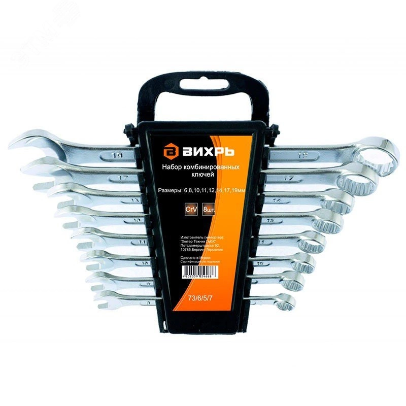 Набор комбинированных ключей 8 шт. 6 - 19 ВИХРЬ - Изготовлены из хромованадиевой стали, имеют хромированное покрытие. Включает 12 гаечных ключей, изготовленных из качественной стали. Применяются для работ с шестигранным крепежом. Комбинированный гаечный ключ - незаменимый инструмент при сборке и разборке любых металлических конструкций. Он сочетает в себе рожковый и накидной гаечные ключи. Первый нужен для работы в труднодоступных местах, второй более эффективен при отворачивании тугого крепежа.