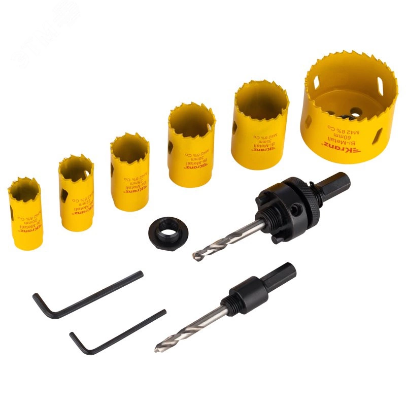Набор биметаллических коронок KRANZ используется во время строительных и ремонтных работ. Подходит для сверления дерева, стали, металла, гипсокартона и пластика в безударном режиме совместно с дрелями, перфораторами и стационарными станками. Коронки выполнены из инструментальной стали, а зубья с переменным шагом 4-6 мм изготовлены из быстрорежущей стали Р6М5К8 с добавлением 8% кобальта. В боковой стенке коронок предусмотрено отверстие, которое компенсирует деформации при перегреве, отводит строительную пыль и шлам. Особая заточка зубьев способствует эффективному входу в материал. Сверление металла/стали необходимо осуществлять с применением смазочно-охлаждающей жидкости. Набор поставляется в металлическим кейсе. В комплектацию входят 6 коронок диаметром 20, 22, 25, 30, 35, 60 мм, 2 хвостовика для коронок, 2 шестигранных ключа, 1 адаптер.