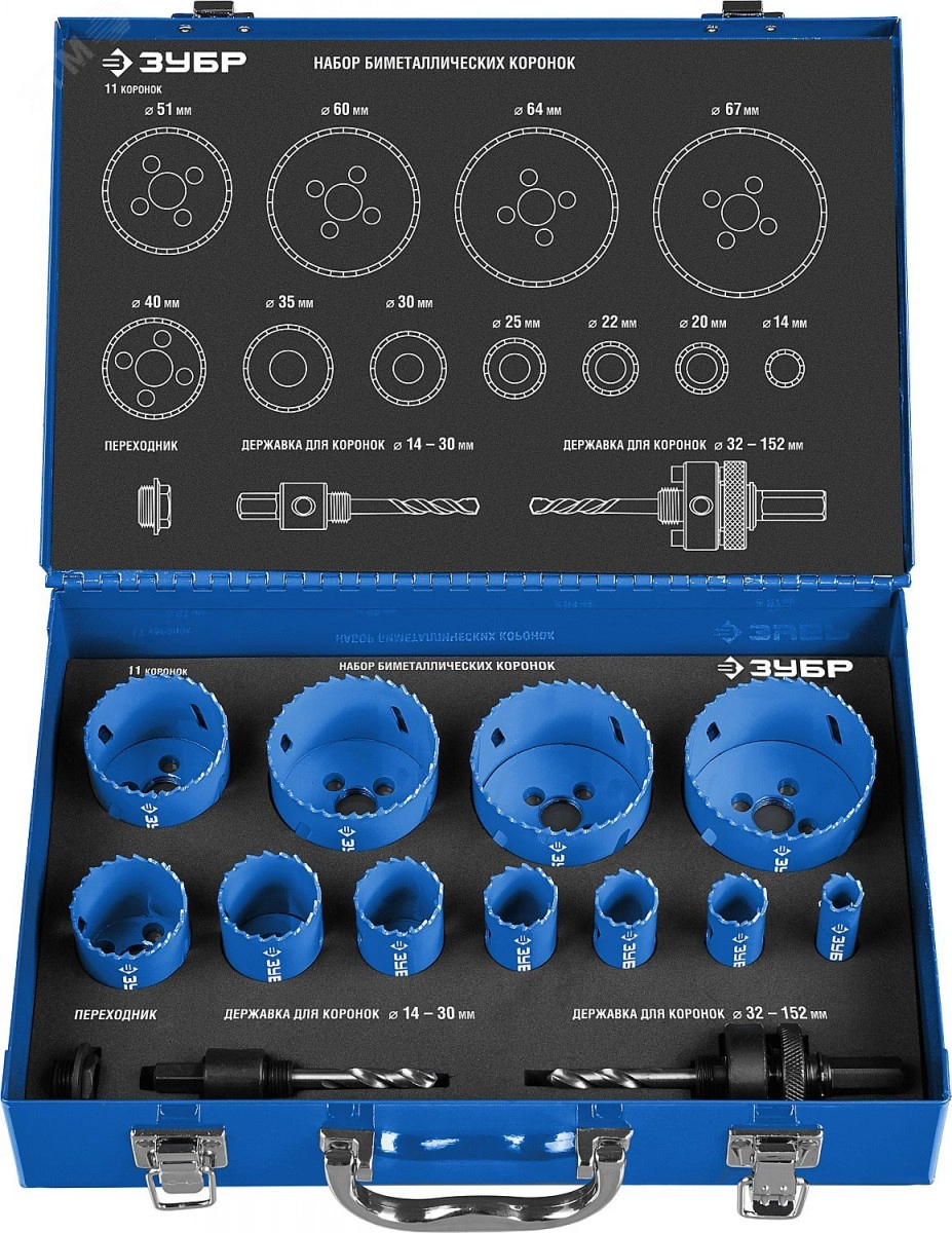Набор коронок биметаллических (14,20,22,25,30,35,40,51,60,64,67) 11шт