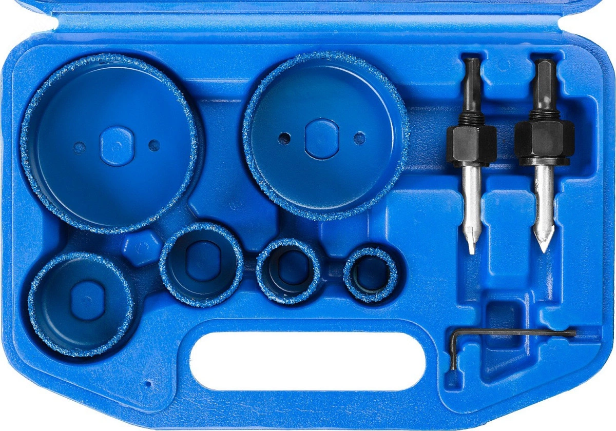 Полное описание: Набор коронок-чашек ''Профессионал'' c карбид-вольфрамовым нанесением, 6 коронок-чашек d 22, 28, 35, 44, 68, 73 мм, 2 державки со сверлами, ключ