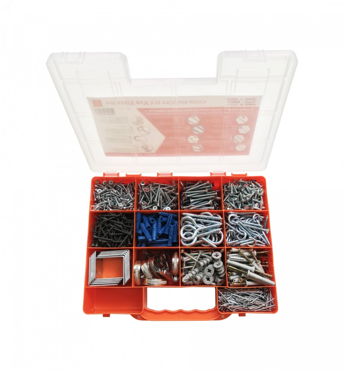 В состав комплекта входят: шурупы-полукольцо 4,0х30 мм (40 шт.), шурупы-кольцо 6,0х40 мм (15 шт.), дюбель-гвозди с грибовидной манжетой из полипропилена SM-G 6,0х40 мм (20 шт.), саморезы универсальные оцинкованные 5,0х40 мм (40 шт.), саморезы универсальные оцинкованные 3,5х16 мм (100 шт.), саморезы универсальные оцинкованные 4,5х35 мм (5 шт.), саморезы универсальные оцинкованные 4,0х30 мм (80 шт.), саморезы металл-металл 4,2х16 мм (100 шт.), саморезы гипсокартон-дерево 3,5х45 мм (80 шт.), нейлоновые дюбели со сверлом для гипсокартона DRIVA PA 14,0х32 мм (5 шт.), дюбели распорные Чапай 6,0х30 мм (50 шт.), гвозди финишные оцинкованные 1,6х30 мм (150 г), хомуты обжимные из нержавеющей стали 16-27 мм (6 шт.), оцинкованные крепежные углы 40х40х40 мм (10 шт.) и оцинкованные крючки для картин, выдерживающие максимальную нагрузку 3 кг (6 шт.)