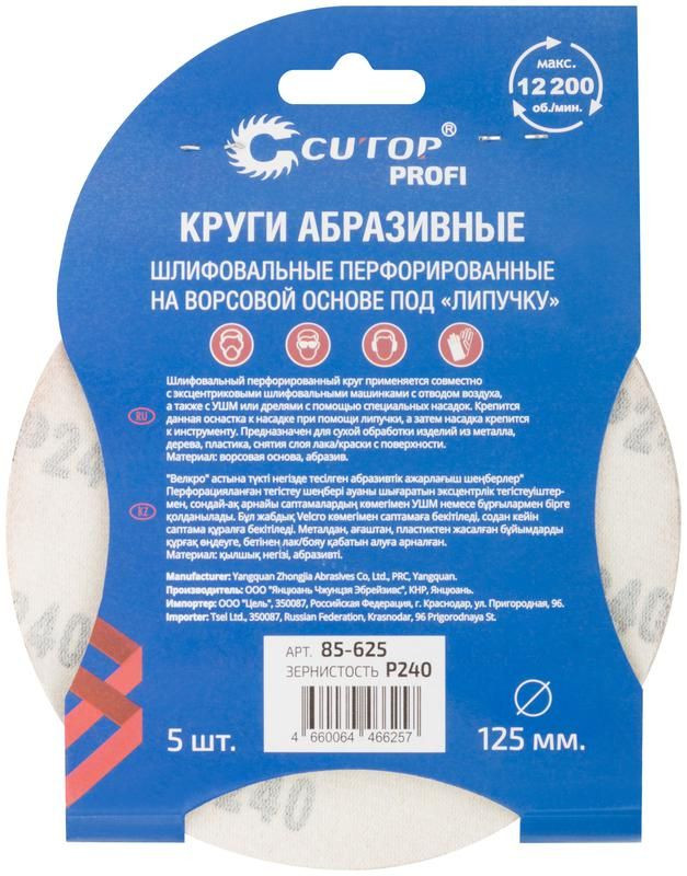 Набор кругов абразивных шлифовальных перфорированных на ворсовой основе под "липучку" Р240 125мм (уп.5шт) Profi Cutop 85-625