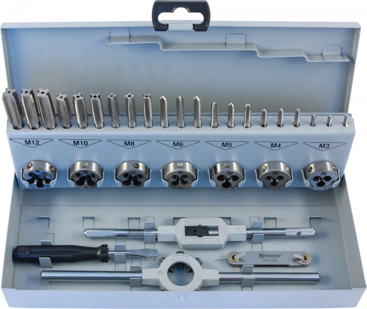 Набор метчиков трехпроходных ручных универсальных и плашек круглых ручных серий COMBO М3-М12, HSS-G, 32 предмета