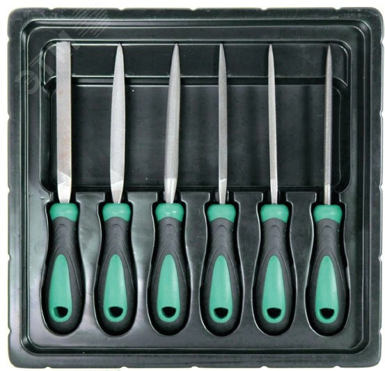 Набор 100 мм надфилей с бархатной насечкой, плотностью 28 зубьев на см. Твердость рабочей поверхности изделий 64-66 HRC. В наборе содержатся плоский, плоский пазовый, полукруглый пазовый, круглый, квадратный и треугольный зауженный надфили. Изделия снабжены резинополимерными рукоятками.