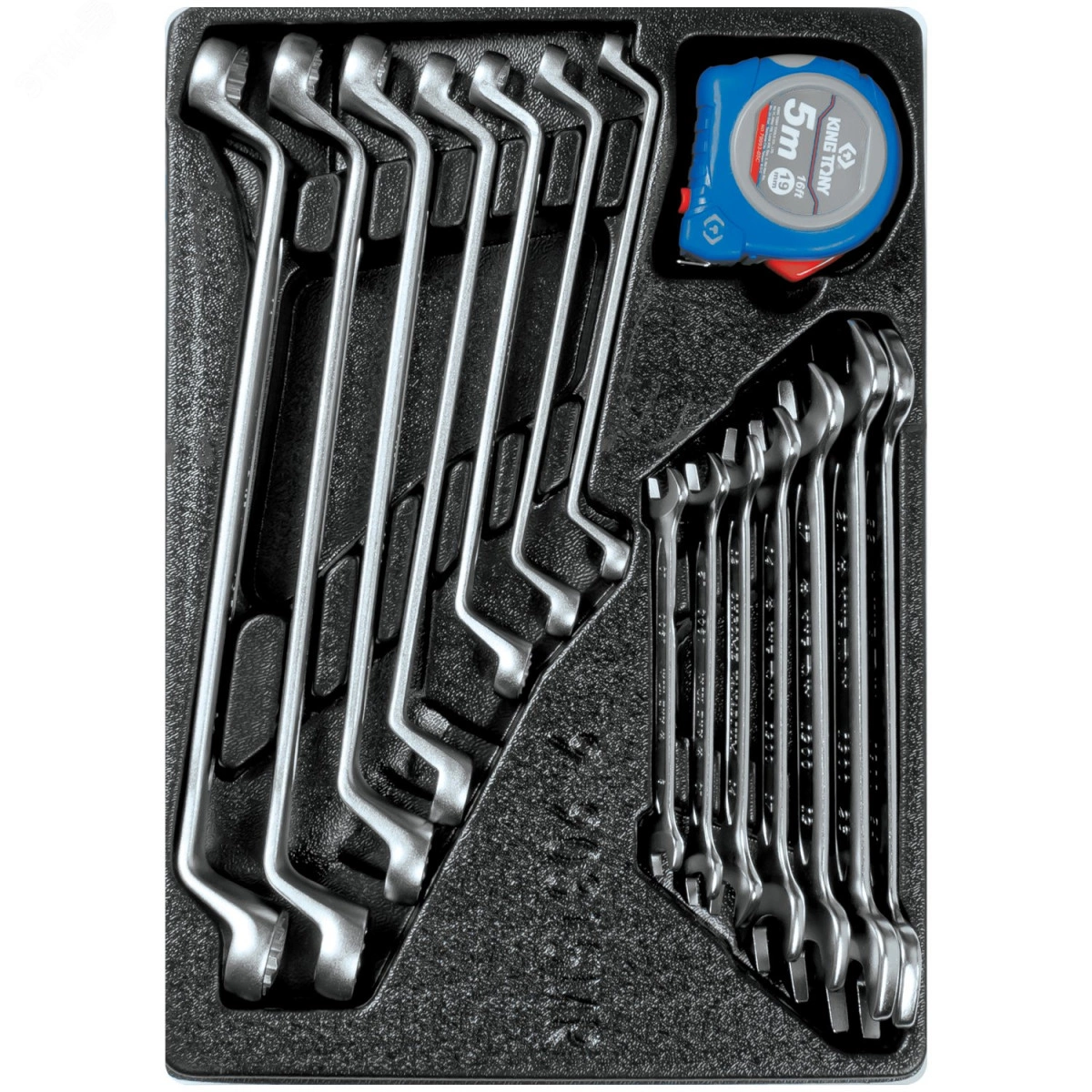 Набор состоит из ручных инструментов разнообразных форм и размеров для возможности выполнения широкого спектра крепежных работ. Также в комплекте представлено измерительное приспособление - рулетка с полотном длиной 5 метров и магнитным крюком на конце. Данный набор располагается на ложементе с отдельными ячейками для каждого элемента, за счет чего подходит для комплектации инструментальных тележек.