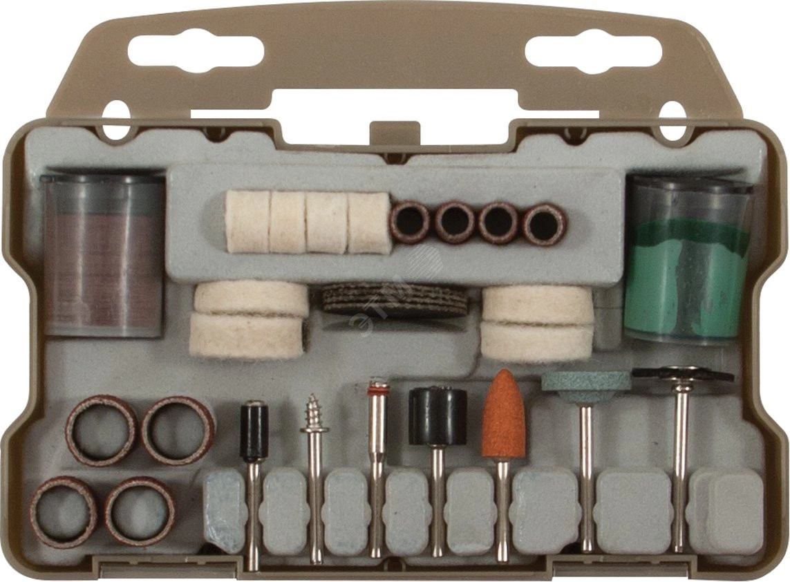 Для гравировальной машины. Для обработки различных материалов. В наборе - трубки наждачные, круги войлочные, насадки войлочные, круги отрезные, шарошки абразивные, шарошки алмазные, корщетки нейлоновые, паста полировальная, патроны цанговые, держатели для полировальных насадок и наждачных трубок. Упаковка - пластиковая коробка.