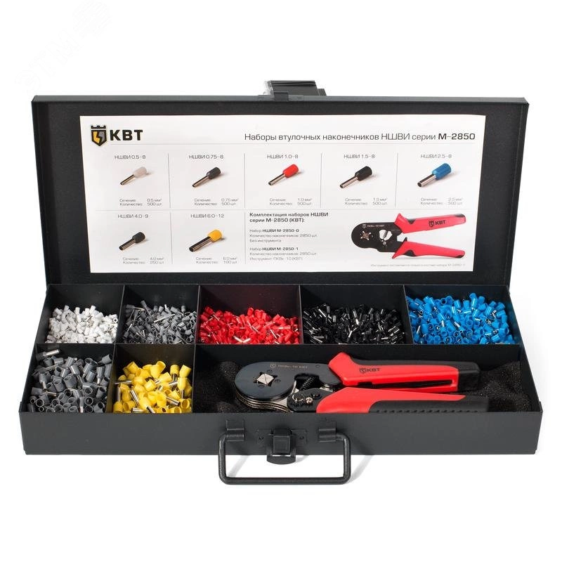 Набор содержит наиболее популярные размеры одинарных втулочных наконечников с универсальным инструментом для опрессовки втулочных наконечников. Цвет изолирующих манжет втулочных наконечников выполнен в соответствии с цветовой маркировкой DIN 46228, часть 4, набор упакован в прочный долговечный металлический кейс с 7 отделениями для втулочных наконечников и большим отделением для хранения инструмента. Габариты стального кейса - 360х160х42 мм. Вес набора (без инструмента) - 1.7 кг. Вес инструмента - 370 г