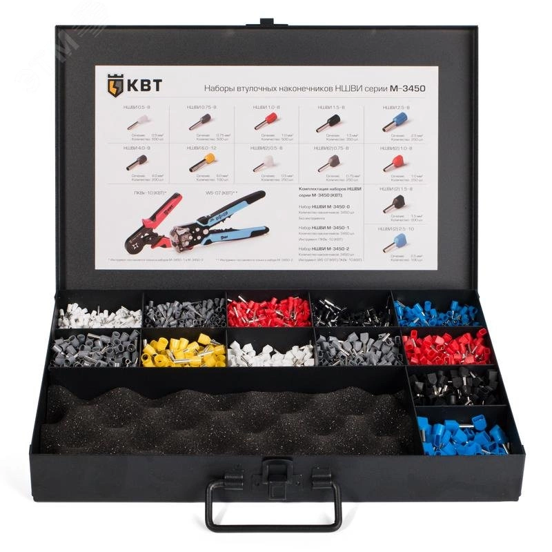 Набор содержит наиболее популярные размеры одинарных и двойных втулочных наконечников. Цвет изолирующих манжет одинарных и двойных втулочных наконечников выполнен в соответствии с DIN 46228, часть 4, набор упакован в прочный долговечный металлический кейс с 12 отделениями для втулочных наконечников и большим отделением для хранения инструмента. Габариты стального кейса - 328х220х42 мм. Вес набора (без инструмента) - 2.2 кг