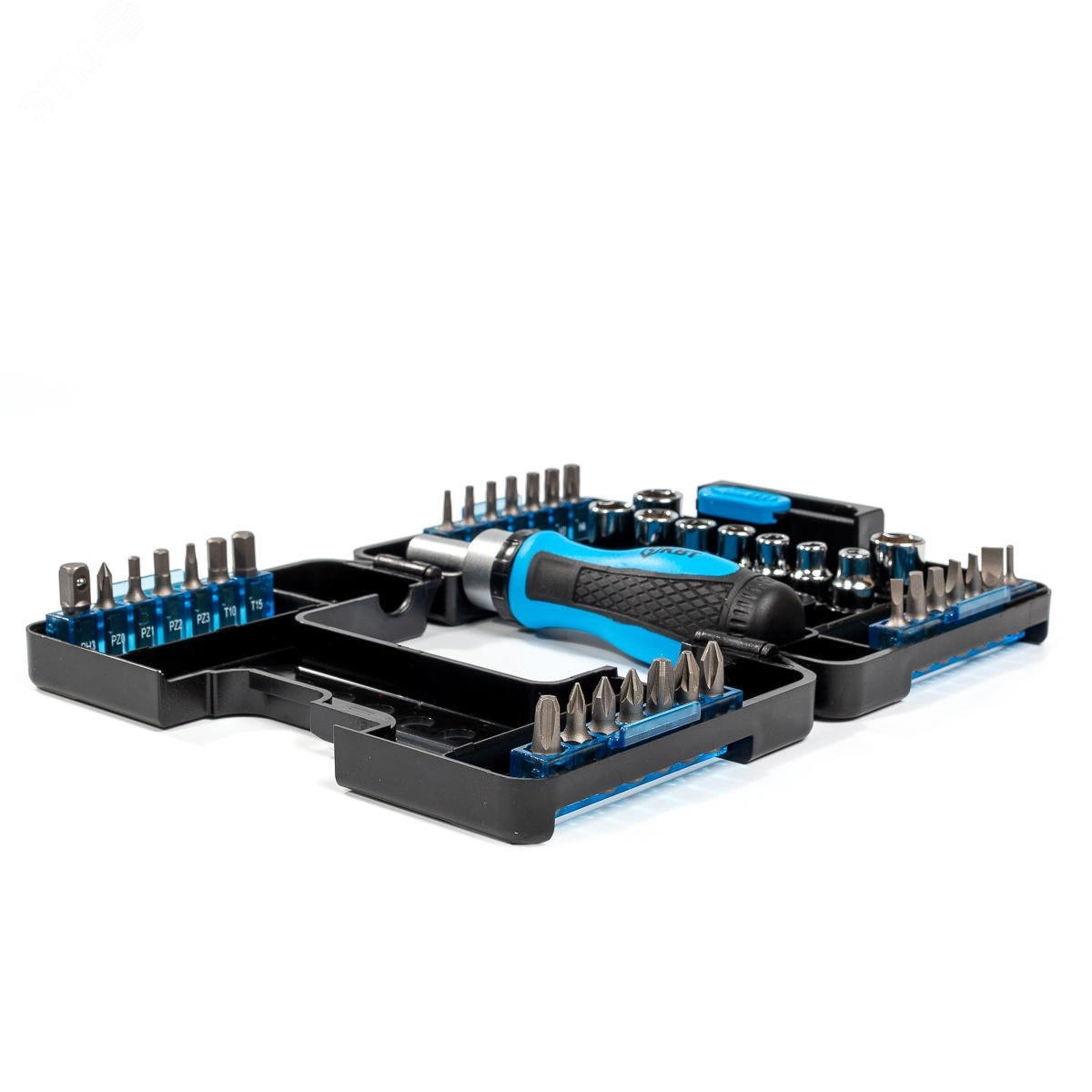 Состав набора - биты шлиц - 3, 4, 5, 6 мм, биты PH\PH0, PH1-PH3, биты PZ\PZ0, PZ1-PZ3, биты TORX - T10-T30, биты шестигранные - H2-H6, биты квадратные - S0-S3, головки шестигранные 1/4' - 4-12 мм, адаптер для установки бит реверсивная отвертка, реверсивная отвертка, Размер бит - 6.35х25 мм. Материал бит - хром-ванадиевая сталь, отвертка с трехпозиционным реверсивным механизмом. Отделение для 4-х бит в рукоятке отвертки. Двухкомпонентная рукоятка с мягкими вставками из термопластрезины. Биты закреплены в кейсе в открывающихся прозрачных отделениях. Маркировка типов бит на внешней стороне отделений и кейсе. Упаковка - пластиковый кейс. Вес - 470 г.