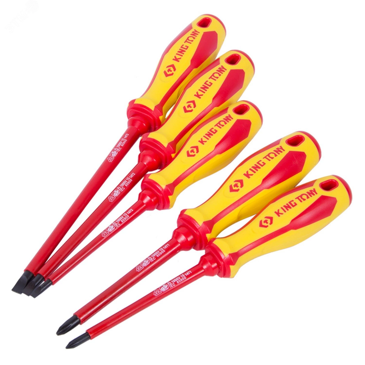Набор отверток торговой марки KING TONYПредназначен для монтажа и демонтажа крепежных узлов различных изделий, устройств и агрегатов. Электроустановки под напряжением до 1000 В. В процессе производства рабочие поверхности инструментов KING TONY подвергаются специальной термической обработке, что придает им особую прочность и стойкость к износу или сколам. Рукоятки инструментов выполнены из двухкомпонентного материала, устойчивого к воздействию моторных масел, бензина, кислот, щелочей и других растворителей. Материал наконечников отверток - SNCM + V – легированная Cr-V сталь, молибден. Материал рукояток - PP + TPR – полипропилен, термопластичная резина Сертификат соответствия качества - IEC 60900 -200, VDE