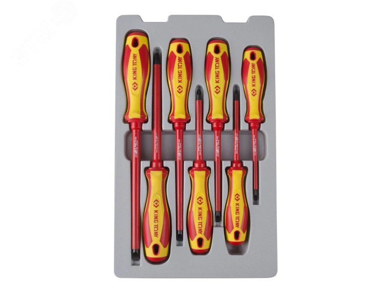 Работа с резьбовыми соединениями, находящимися под напряжением до 1000 В. Инструмент обладает классом безопасности VDE 1000V. Рабочие поверхности отверток King Tony. В процессе изготовления подвергаются специальной термической обработке, что придает им особую прочность и стойкость к износу или сколам. Эргономичная форма рукояток - отвертка удобно и надежно лежит в руке