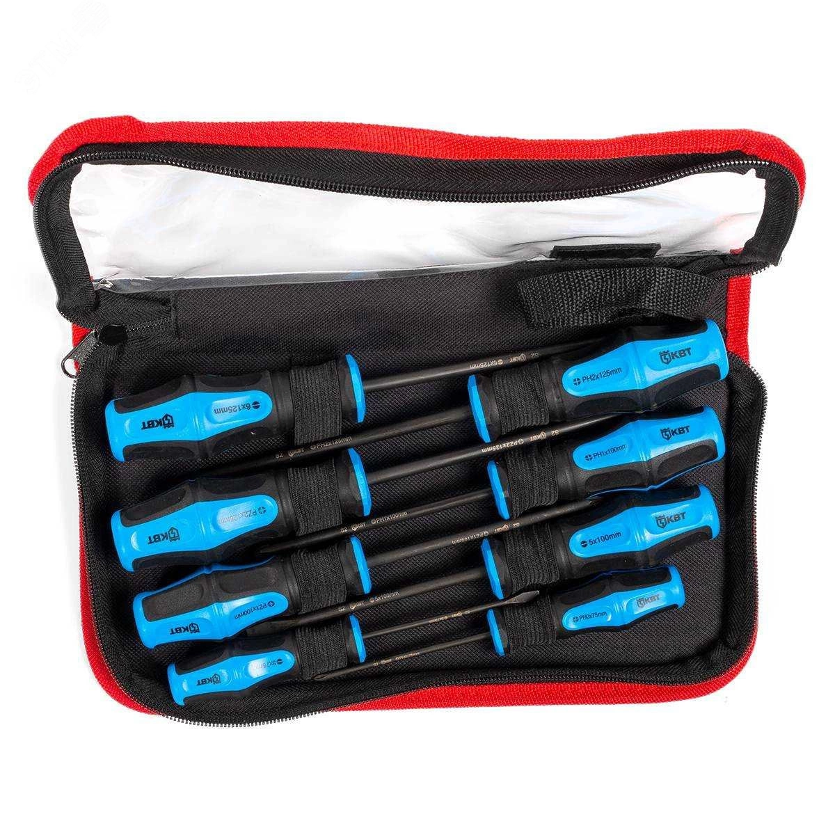 Состав набора - отвертка шлиц 3.0х75, отвертка шлиц 5.0х100, отвертка шлиц 6.0х125, отвертка PH0х75, отвертка PH1х100, отвертка PH2х125, отвертка PZ1х100, отвертка PZ2х125. Стержни из высококачественной инструментальной легированной стали S2. Покрытие стержня - черное фосфатирование. Намагниченный вороненый наконечник. Двухкомпонентная рукоятка с мягкими прорезиненными вставками. Маркировка на торце рукояток с обозначением типа профилей. Специальная форма рукоятки, не позволяющая инструменту скатываться с наклонной поверхности. Упаковка - кофр с прозрачной крышкой