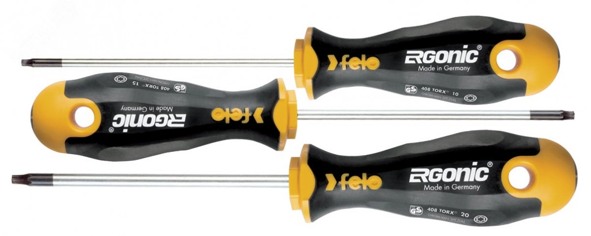 Набор отверток Felo предназначен для проведения монтажно-демонтажных работ с крепежом типа Torx. Рукоятка ERGONIC - первая в мире эргономичная рукоятка, которая адаптируется под руку пользователя, снижает нагрузку и утомляемость, а также увеличивает комфорт и максимальный крутящий момент. Дизайн рукоятки не позволяет инструменту скатываться с поверхности. На верхней части рукоятки указан тип шлица. Стержень изготовлен из хром-молибден-ванадиевой стали, закаленной в масле, износостойкость которой превышает технические требования DIN и ISO. В набор входит 3 отвертки Tx 10, 15, 20.