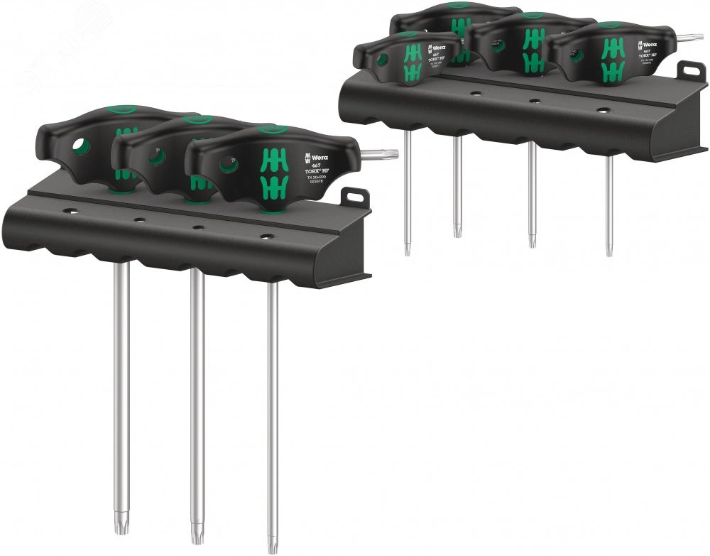 Набор отвёрток с Т-образной рукояткой с двумя подставками 467/7 TORX HF Set 1 с функцией фиксации крепежа TX 10 - 45 7 предметов комплектация: 7x 467 TORX HF Отвёртка с поперечной ручкой с фиксирующей функцией: TX 10x100 TX 15x100 TX 20x100 TX 2