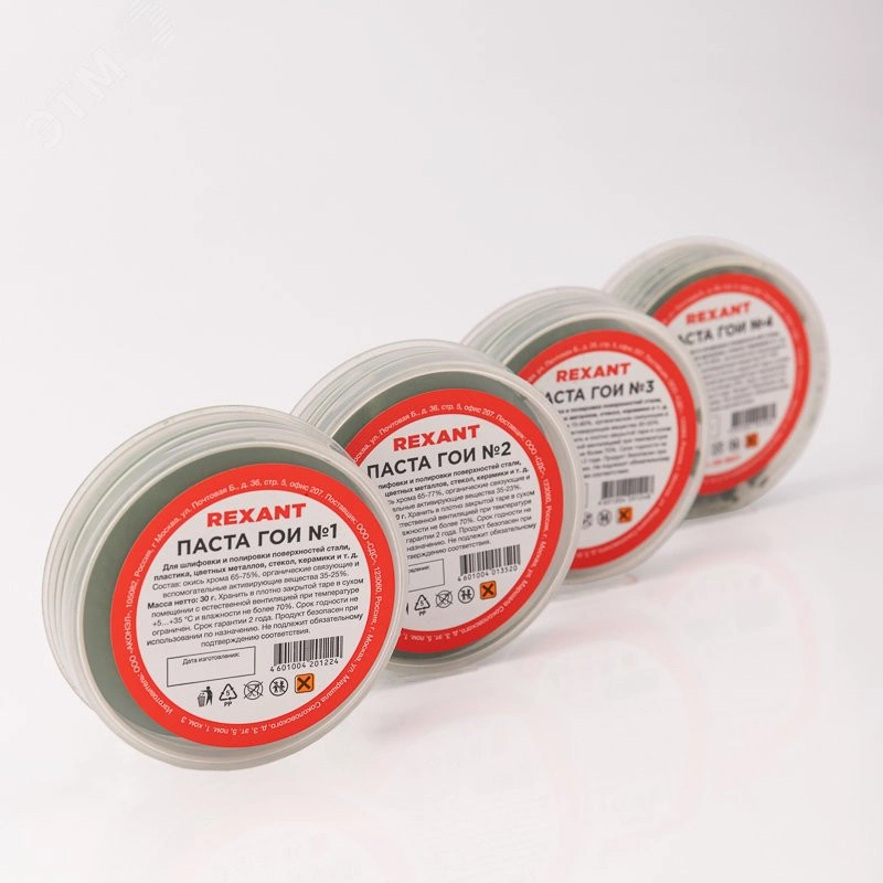 Паста ГОИ REXANT предназначена для шлифования и полирования стальных сплавов, цветных металлов, твердых пластмасс и полимеров, стекла (в том числе оптического), керамических материалов и изделий из них, тем самым устраняя мелкие царапины и создавая ровный блеск полируемой поверхности. Паста состоит из оксида хрома, который придает зеленый цвет, в виде абразивного порошка, жировых органических связующих, а также вспомогательных веществ, которые делают добавки более активными и интенсивными. При правильном использовании паста позволит добиться идеально ровного покрытия и вернет первозданный вид различным предметам.