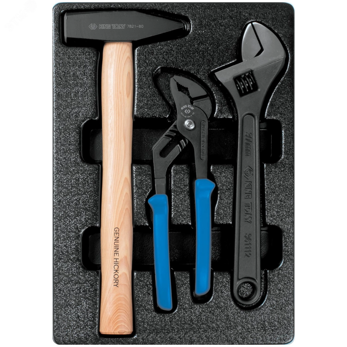 Набор фирмы KING TONY состоит из 3-х предметов. Входящие в состав набора силовые инструменты предназначены для работ с трубными соединениями и другим крепежом. Молоток немецкого типа изготовлен из высококачественной стали, устойчивой к сколам. Прочная рукоятка из канадского орешника устойчива к износу, не подвержена воздействию влаги, удобно и надежно лежит в руке. Материал ложемента – ПВХ (поливинилхлорид). Изготовлен специально для комплектации инструментальной тележки.