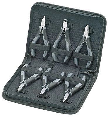 00 20 17 Набор инструментов для электроники Размеры, в закрытом состоянии (Ш x В x Г) - 215 x 160 x 50 мм. укомплектован 6 плоскогубцами для электроники, антистатическими. футляр из прочного полиэстера, крепление щипцов из резиновой эластичной ленты, замок на молнии. Комплект поставки - 1 x 35 12 115 ESD KNIPEX Плоскогубцы захватные для электроники антистатические, 1 x 35 22 115 ESD KNIPEX Плоскогубцы захватные для электроники антистатические, 1 x 35 42 115 ESD KNIPEX Плоскогубцы захватные для электроники антистатические, 1 x 77 02 115 ESD KNIPEX Бокорезы для электроники антистатические, 1 x 77 32 115 ESD KNIPEX Бокорезы для электроники антистатические, 1 x 64 32 120 ESD KNIPEX Кусачки торцевые для электроники антистатические,