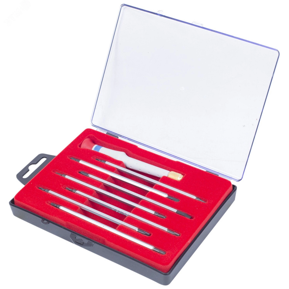 Включает в себя эргономичную отверточную рукоятку, которая имеет возможность замены стержней. В наборе представлено 7 двусторонних стержней с разнообразными профилями наконечников для выполнения мелких крепежных работ. Такой набор станет прекрасным помощником для работы в сфере точной механики. Для удобства хранения и транспортировки приспособлений предусмотрен футляр с отдельными ложементами для каждого компонента.