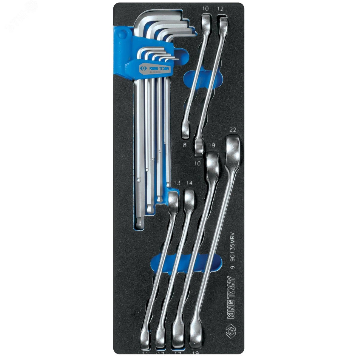 Набор торговой марки KING TONY включает в себя шестигранники для работы с внутренним профилем и разрезные ключи. Предназначен для монтажа и демонтажа крепежных узлов различных изделий, устройств и агрегатов. Входящие в состав разрезные ключи предназначены для работ с гайками, расположенными на трубках, длинных шпильках и т.п. Размер ложемента адаптирован для размещения на полке инструментальной тележки