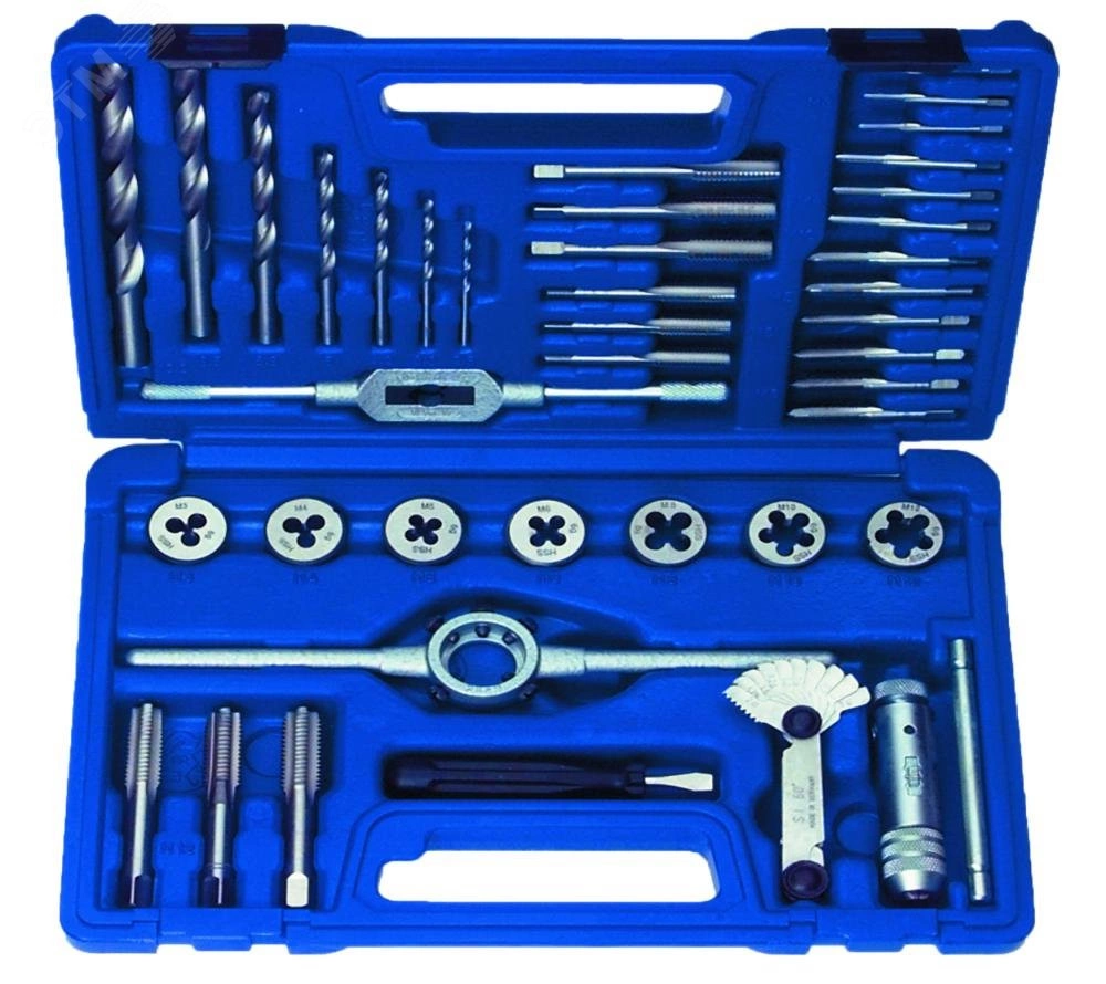 Набор резьбонарезного инструмента используется для нарезки всевозможных видов резьбы. В наборе присутствуют инструменты самых ходовых размеров. Поставляется в кейсе для удобства транспортировки и хранения. Внутри кейса есть ложементы для каждого инструмента, а крепкая защелка препятствует случайному открыванию и выпадению приспособлений.