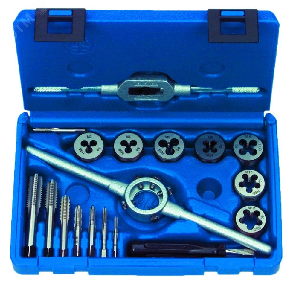 Набор резьбонарезного инструмента используется для нарезки всевозможных видов резьбы. В наборе присутствуют инструменты самых ходовых размеров. Поставляется в кейсе для удобства транспортировки и хранения. Внутри кейса есть ложементы для каждого инструмента, а крепкая защелка препятствует случайному открыванию и выпадению приспособлений.