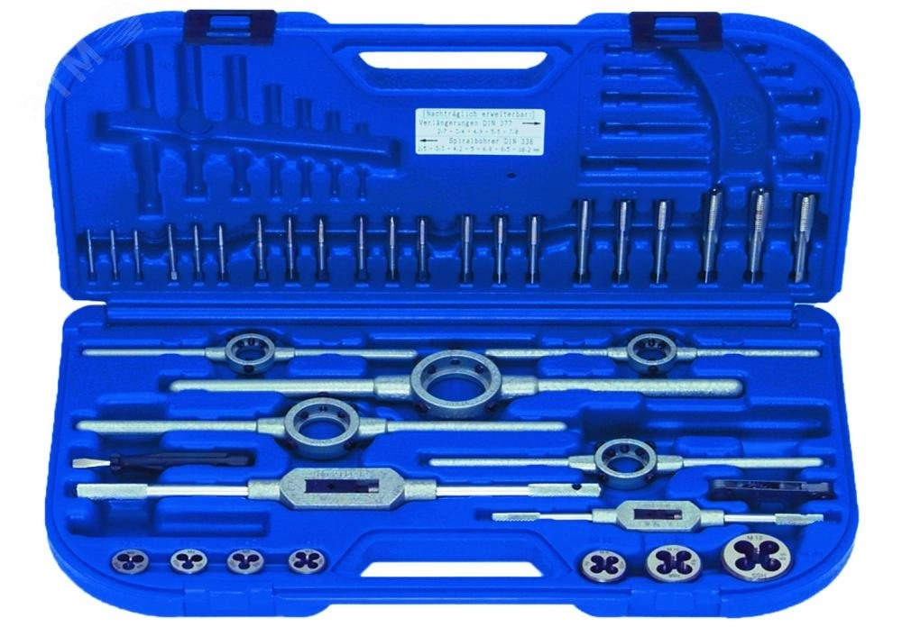 Набор резьбонарезного инструмента используется для нарезки всевозможных видов резьбы. В наборе присутствуют инструменты самых ходовых размеров. Поставляется в кейсе для удобства транспортировки и хранения. Внутри кейса есть ложементы для каждого инструмента, а крепкая защелка препятствует случайному открыванию и выпадению приспособлений.