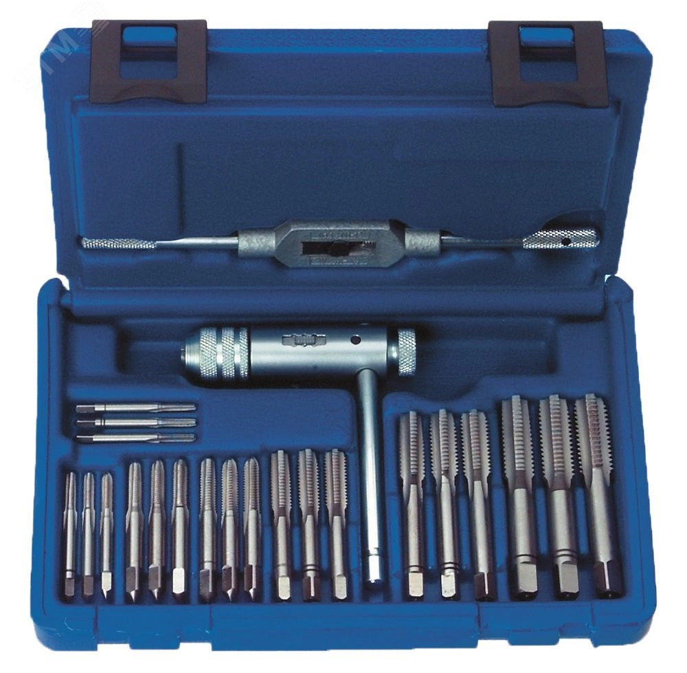 Набор резьбонарезного инструмента используется для нарезки всевозможных видов резьбы. В наборе присутствуют инструменты самых ходовых размеров. Поставляется в кейсе для удобства транспортировки и хранения. Внутри кейса есть ложементы для каждого инструмента, а крепкая защелка препятствует случайному открыванию и выпадению приспособлений.
