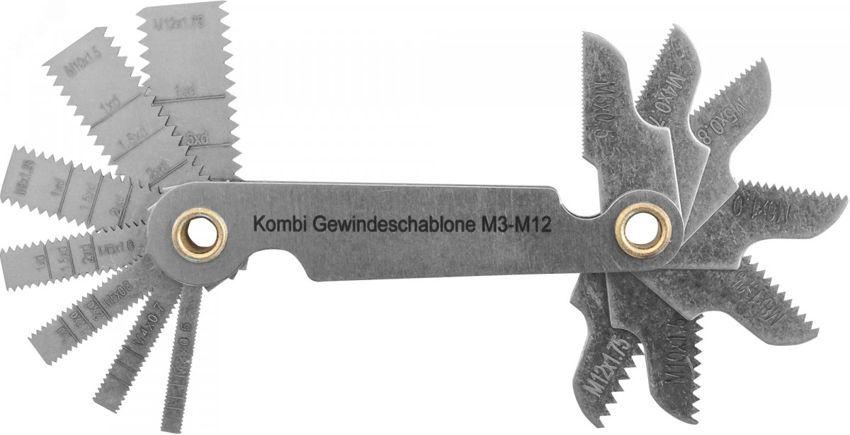 Комбинированный инструмент, состоящий из 7 стандартных пластин для измерения наружных резьб и 7 пластин с двухсторонним расположением измерительной гребенки для измерения внутренних резьб. Состав: 0,5, 0,7, 0,8, 1, 1,25, 1,5, 1,75 мм, М3Х0,5, М4Х0,7, М5Х0,8, М6Х1,0, М8Х1,25, М10Х1,5, М12Х1,75 мм.