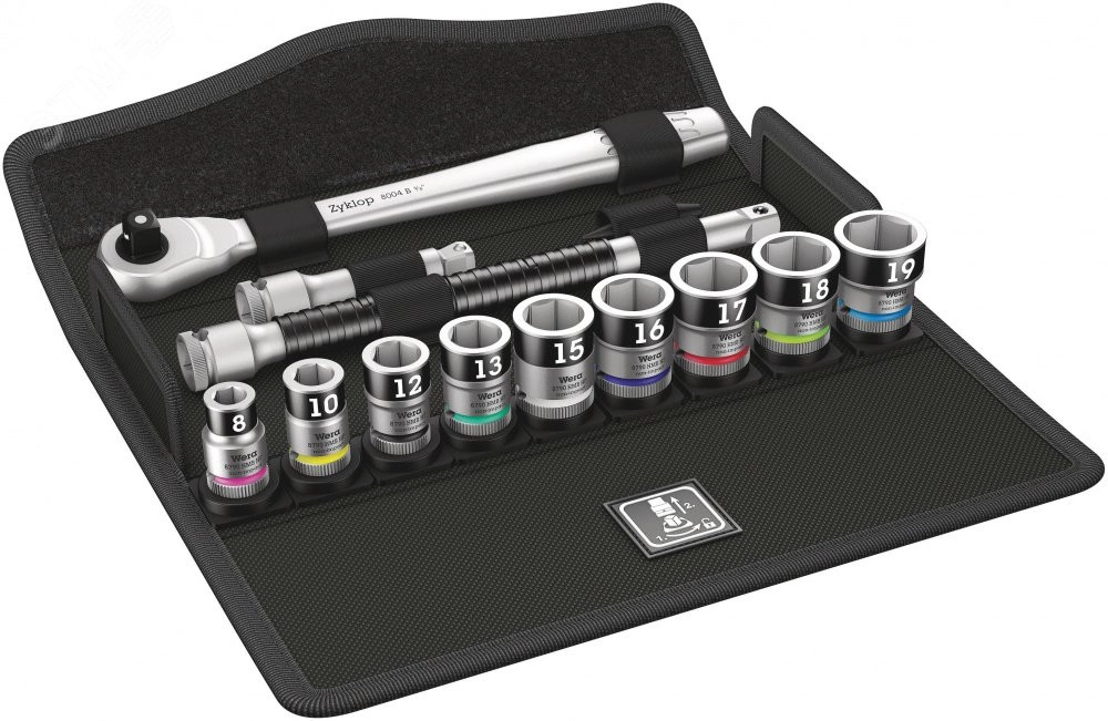 Набор с трещоткой 8100 SB HF 1 Zyklop Metal Switch переключение реверса DR 3/8 с функцией фиксации крепежа 13 предметов комплектация: 1x 8004 B Zyklop Metal трещотка переключение реверса привод 3/8 3/8 x 222 мм 9x 8790 HMB HF торцевая головка Zy