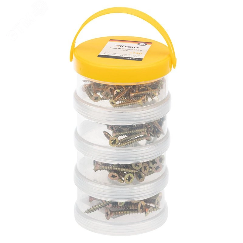 Саморезы в наборе используются для крепления тонколистового металла, древесно-стружечных и гипсокартонных плит, брусьев, досок, полимерных ламелей к основаниям из массива без предварительного сверления. В комплексе с пластиковым дюбелем универсальные саморезы (PZ) DIN 7962 могут использоваться для крепления к бетону, кирпичу, шлакоблоку. Набор состоит из 1. Саморезы для ДСП - 3,0x19 - 60 шт, - 3,5x25 - 40 шт, - 4,0x30 - 25 шт, - 4,5x40 - 15 шт. 2. Пластиковый органайзер.